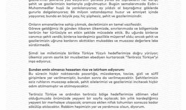 Cumhurbaşkanı Recep Tayyip Erdoğan, şehit yakınları ve gazilere teker teker yazdığı mektupla, müsterih olmalarını ve Terörsüz Türkiye sürecinin hiç bir noktasında pazarlığa, müzakereye, tavize, gizli ve süfli girişimlere yer verilmediğini, bundan sonra da verilmeyeceğini söylemesi şehit yakınları ve gazileri duygulandırdı.