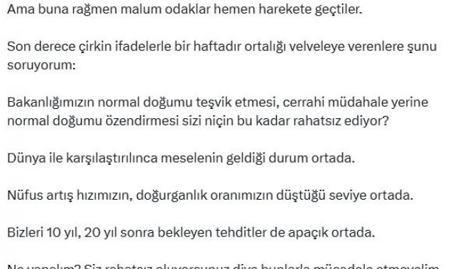 Bakanlığımızın normal doğumu teşvik etmesi, cerrahi müdahale yerine normal doğumu özendirmesi sizi niçin bu kadar rahatsız ediyor? Dünya ile karşılaştırılınca meselenin geldiği durum ortada. Nüfus artış hızımızın, doğurganlık oranımızın düştüğü seviye ortada. Bizleri 10 yıl, 20 yıl sonra bekleyen tehditler de apaçık ortada. Ne yapalım? Siz rahatsız oluyorsunuz diye bunlarla mücadele etmeyelim mi? Tedbir almayalım mı? Toplumu doğru yönlendirmeyelim mi? Bizim bu hezeyanlara, birilerinin ideolojik saplantılarına ayıracak vaktimiz yok. Bu konuyla ilgili tavizsiz duruşumuzu bundan sonra da muhafaza edeceğiz. Birileri karşı çıksa da biz ülkemiz ve milletimiz için en doğru olanı yapmayı sürdüreceğiz."