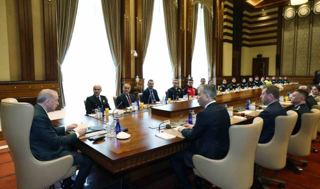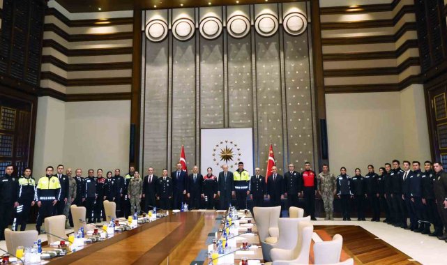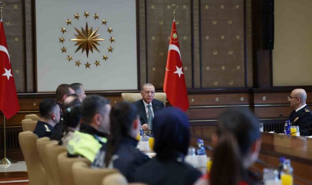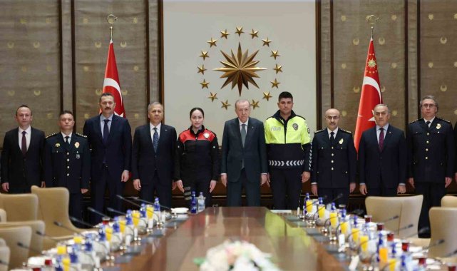 Cumhurbaşkanı Recep Tayyip Erdoğan, İçişleri Bakanı Ali Yerlikaya ve Türk Polis Teşkilatı heyetini Cumhurbaşkanlığı Külliyesi'nde kabul etti. Polis Teşkilatı'nın kuruluşunun 180. yıldönümü münasebetiyle emniyet teşkilatı mensuplarıyla bir araya gelmekten mutluluk duyduğunu belirten Cumhurbaşkanı Erdoğan, "İçişleri Bakanlığımız ve Emniyet Genel Müdürlüğümüz başta olmak üzere bu güzel buluşmaya vesile olan herkese yürekten teşekkür ediyorum. Bir yandan özellikle ülkemiz, diğer yandan teşkilatımızın bu gayretlerini görmemezlikten gelmemiz mümkün değil. Ve bugün sizlerle bir araya gelerek bu anlamlı programı gerçekleştirmek bizleri gerçekten mutlu etmiştir. Polis Teşkilatımızın 180. kuruluş yıldönümünü özellikle canı gönülden tebrik ediyorum. Yarından itibaren kutlamaya başlayacağımız Polis Haftası'nın da emniyet teşkilatımız, ülkemiz ve milletimiz için hayırlara vesile olmasını diliyorum. Hafta boyunca yapılacak etkinliklerin aramızdaki birlik ve beraberliği güçlendirmesini temenni ediyorum. Ülkemizin emniyeti, milletimizin geleceği için tereddüt etmeden canlarını feda eden tüm şehit polislerimizi, askerlerimizi, jandarmalarımızı, güvenlik korucularımızı rahmetle yad ediyorum. Hayatta olan gazilerimize hayırlı ve bereketli ömürler diliyor, her birine şahsım ve milletim adına şükranlarımı sunuyorum. Emniyet teşkilatı olarak sizler son derece önemli, önemli olduğu kadar da bizleri geleceğe taşıyan hem de canlarınız pahasına bir icra kabiliyeti taşıyorsunuz. Bir yandan ülkemiz sathında huzur ve asayişi sağlarken, diğer yandan suçun ve suçlunun her türlüsüyle cansiparane mücadele ediyorsunuz" dedi.