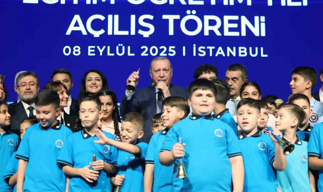 Cumhurbaşkanı Erdoğan, konuşmasının ardından öğrencilerle birlikte ilk ders zilini çaldı.