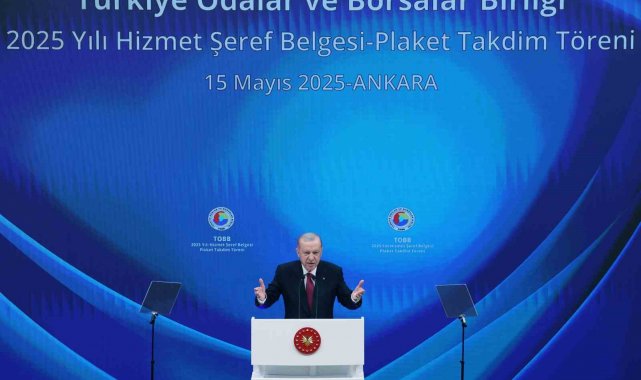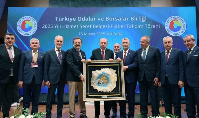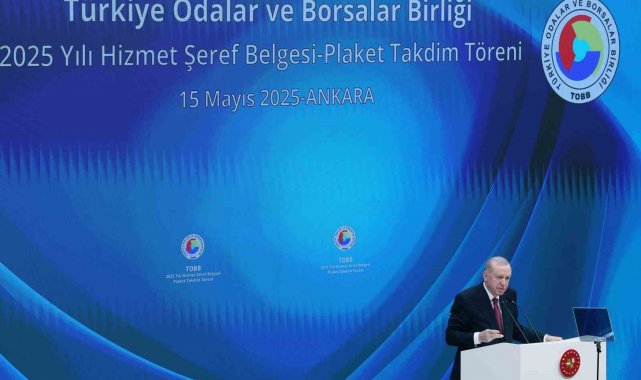 Cumhurbaşkanı Recep Tayyip Erdoğan, Türkiye Odalar ve Borsalar Birliği (TOBB) tarafından düzenlenen 2025 Yılı Hizmet Şeref Belgesi ve Plaket Takdim Töreni'ne katıldı. Törende konuşan Cumhurbaşkanı Erdoğan, program vesilesiyle iş dünyası temsilcileriyle bir araya gelmekten memnuniyet duyduğunu ifade etti. TOBB'un önemli bir geleneği haline gelen bu anlamlı töreninin her yıl mayıs ayında gerçekleştirildiğini belirten Erdoğan, "Bugün bir kez daha bu güzel atmosferde gönüllerimizi buluşturan Sayın Başkana ve birlik yönetimine teşekkür ediyorum" dedi.