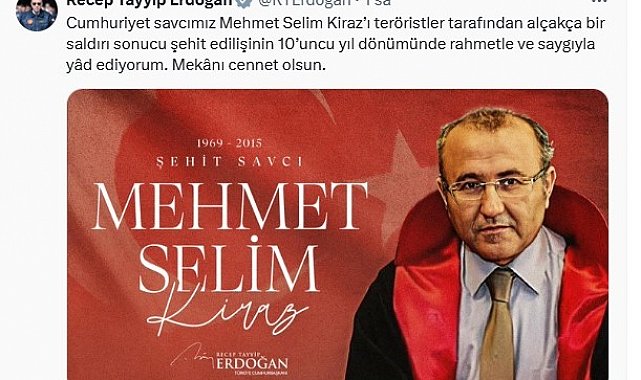Cumhurbaşkanı Recep Tayyip Erdoğan, görevi başında şehit edilen Savcı Mehmet Selim Kiraz'ı andı. Cumhurbaşkanı Erdoğan, resmi sosyal medya hesabından yaptığı paylaşımda, "Cumhuriyet Savcımız Mehmet Selim Kiraz'ı teröristler tarafından alçakça bir saldırı sonucu şehit edilişinin 10'uncu yıl dönümünde rahmetle ve saygıyla yad ediyorum. Mekanı cennet olsun" ifadelerini kullandı.