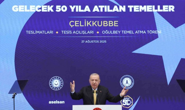 Cumhurbaşkanı Recep Tayyip Erdoğan, ASELSAN Gölbaşı Yerleşkesi'nde Çelik Kubbe Teslimatları, Tesis Açılışları ve Oğulbey Temel Atma Töreni'ne katıldı. Cumhurbaşkanı Erdoğan, ASELSAN'ın 50. yılında milletin göz bebeği bu şirketi gelecek 50 yılına yön verecek projelere öncülük etmenin bahtiyarlığı içinde olduklarını belirtti. Ağustos ayının millet için özel bir ay olduğunu belirten Erdoğan, "Malazgirt, Çaldıran, Mohaç ve Büyük Taarruz gibi kaderimizi tayin eden nice önemli zaferi bu ayda kazandık. Dün Sultan Alparslan'ı ve ordusundaki kahraman yiğitleri yad etmek üzere bize bu toprakların kapılarını açan Malazgirt'teydik. Önce Ahlat'ta ardından Malazgirt Meydanı'nda muhteşem bir buluşmaya imza attık. 30 Ağustos'ta ise bu topraklardaki varlığımızı sonsuza dek mühürleyen büyük zaferi kutlayacağız. Bugün ise zafer haftasında bir başka gururu yaşıyoruz. Silahlı kuvvetlerimize güç katacak ve savunma sanayimizi bambaşka bir seviyeye taşıyacak 3 değerli hamleyi birlikte yapıyoruz. Bunların ilki Çelik Kubbe bileşeni sistemlerin envantere girmesi. İkincisi ASELSAN'ın 14 tesisinin açılışıdır. Üçüncüsü de Oğulbey Teknoloji Üssü'nün temelinin atılmasıdır. Yani Aselsan açısından bu tarihi günde sadece bir şirketin değil aynı zamanda bir milletin bağımsızlık yolculuğunun alın terinin, azminin ve kararlılığının yeni bir safhasına hep birlikte şahitlik ediyoruz. Şehitlerimizin ruhlarını da şahit edeceğine inandığım tüm bu adımların ASELSAN'ımıza savunma sanayimize ve Türk Silahlı Kuvvetlerimize hayırlı uğurlu olmasını diliyorum. Bu vesileyle kuruluşundan itibaren 50 yıl boyunca ASELSAN çatısı altında Türk savunma sanayine katkılarda bulunmuş herkesi şükranla yad ediyorum. Aynı şekilde şirketimiz bünyesinde emek veren ter döken yöneticisinden mühendisine tüm kardeşlerimi ASELSAN ailesinin her bir ferdini kutluyor. Ülkem ve milletim adına kendilerine teşekkür ediyorum" diye konuştu.