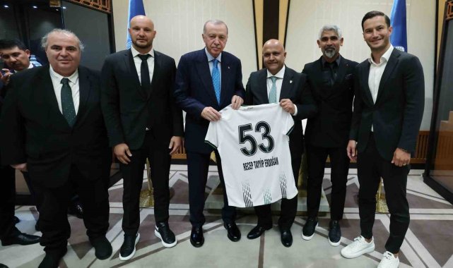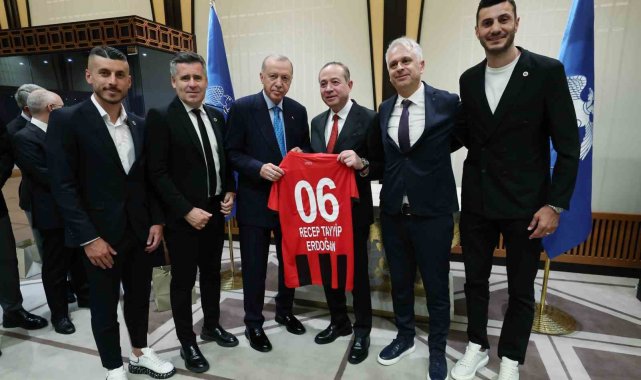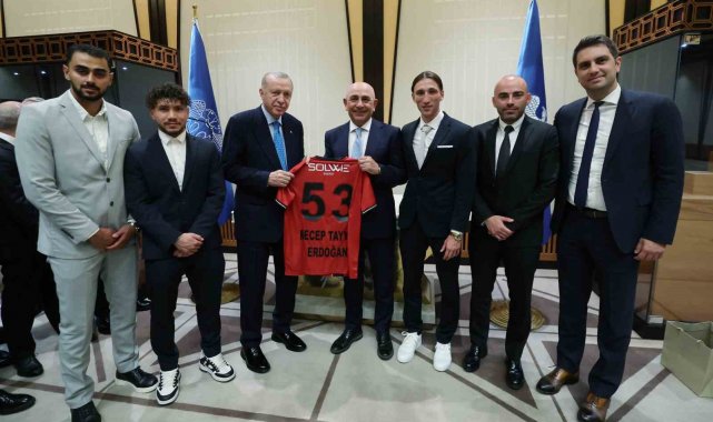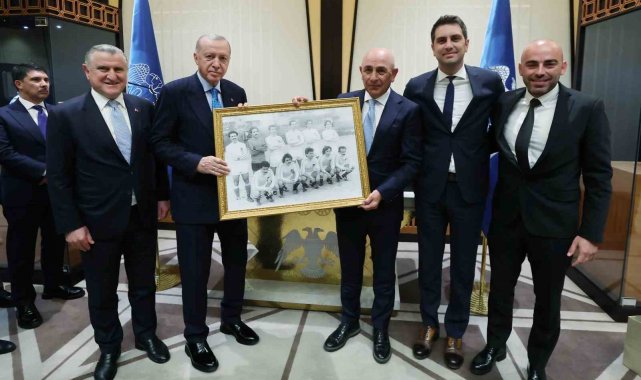 Takım başkanları tarafından Cumhurbaşkanı Erdoğan'a forma ve futbol oynadığı döneme ait fotoğrafın hediye edildiği kabulde, hatıra fotoğrafı çektirildi.