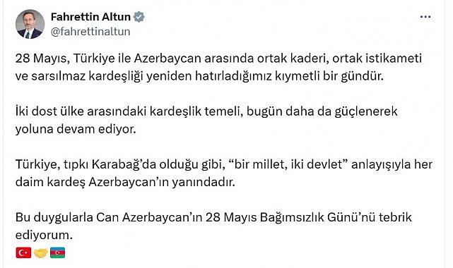 Cumhurbaşkanlığı İletişim Başkanı Fahrettin Altun, Azerbaycan'ın 28 Mayıs Bağımsızlık Günü dolayısıyla sosyal medya hesabından mesaj yayımladı. Altun, mesajında şu ifadelere yer verdi: