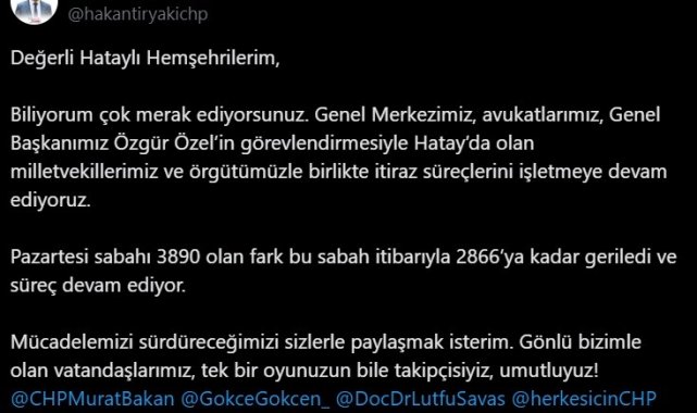 Söz konusu sosyal medya paylaşımında CHP İl Başkanı Tiryaki, "Değerli Hataylı hemşehrilerim. Biliyorum çok merak ediyorsunuz. Genel Merkezimiz, avukatlarımız, Genel Başkanımız Özgür Özel'in görevlendirmesiyle Hatay'da olan milletvekillerimiz ve örgütümüzle birlikte itiraz süreçlerini işletmeye devam ediyoruz. Pazartesi sabahı 3 bin 890 olan fark bu sabah itibarıyla 2 bin 866'ya kadar geriledi ve süreç devam ediyor. Mücadelemizi sürdüreceğimizi sizlerle paylaşmak isterim. Gönlü bizimle olan vatandaşlarımız, tek bir oyunuzun bile takipçisiyiz, umutluyuz" ifadelerini kullandı.