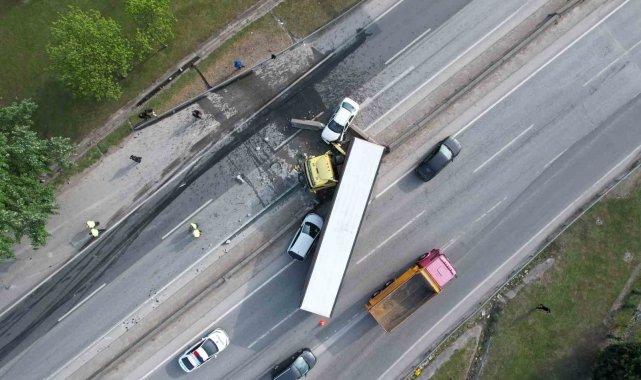 100 karayolunda kontrolden çıkarak bariyerleri aşan tır karşı şeride geçti. 4 aracın karıştığı zincirleme trafik kazasında ortalık adeta savaş alanına döndü. Kazada 1 kişi hafif şekilde yaralanırken, bölgede oluşan trafik dron ile görüntülendi.