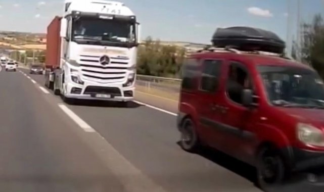 Olay, dün saat 12.30 sıralarında D-110 Karayolu Tekirdağ merkez Süleymanpaşa ilçe İstanbul istikametinde meydana geldi. Tekirdağ çıkışında 34 HFR 687 plakalı tırın, trafikteki araçlara selektör yaparak taciz edici şekilde ilerlediği anlarda önündeki otomobildekiler kısa süreli korku dolu anlar yaşadı. Tehlikeli anları bir otomobilin güvenlik kamerası tarafından saniye saniye kaydedilirken, yolda bulunan vatandaşlar, yaşananlara tepki gösterdi. Olayın tanıklarından Azad Akbaloğlu, şunları söyledi: