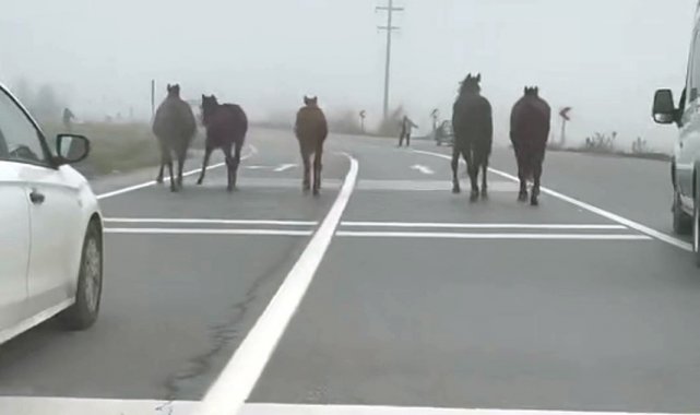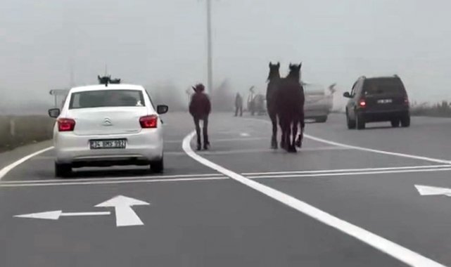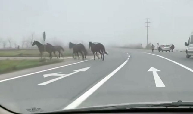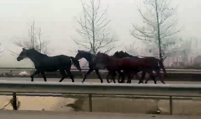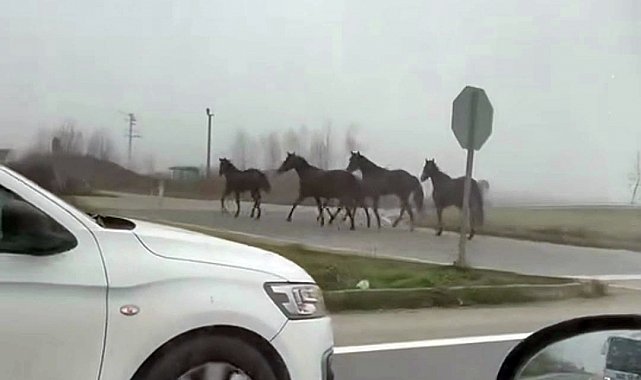 Sakarya'nın Akyazı ilçesi D-140 kara yoluna çıkan atlar dörtnala koştu. Görenleri hayrete düşüren anlar saniye saniye cep telefonu kamerasıyla kaydedildi.