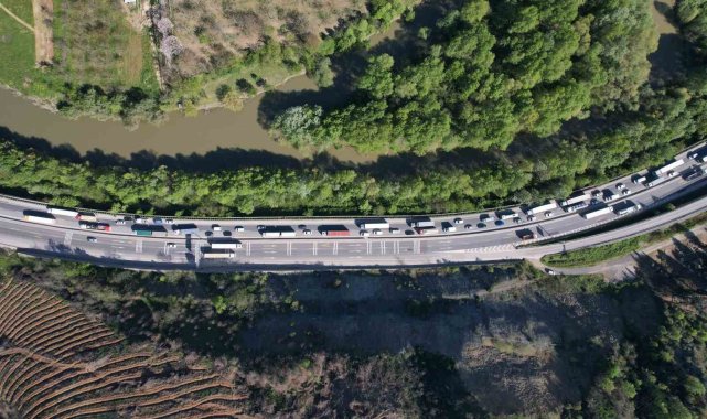 Kazaya ilişkin inceleme başlatılırken, bölgede oluşan trafik yoğunluğu havadan görüntülendi.