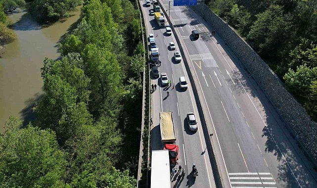 Sakarya'nın Geyve ilçesi D-650 kara yolunda iki çekicinin karıştığı trafik kazası meydana geldi. Kaza nedeniyle Bilecik-Sakarya istikametinde uzun araç kuyrukları oluşurken trafik tek şeritten kontrollü şekilde sağlandı. Oluşan trafik yoğunluğu havadan görüntülendi.