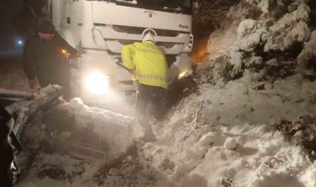 Tokat-Niksar D850 karayolu Musapınarı mevkiinde bir tırın makaslaması sonucu yol trafiğe kapandı. İhbarın ardından Erbaa Bölge Trafik İstasyon Amirliğine bağlı ekipler, kısa sürede olay yerine sevk edildi. Yoğun kar yağışı ve buzlanmanın etkili olduğu bölgede çalışmalar zaman zaman güçlükle yürütüldü. Polis ekipleri, Karayolları ekipleri ve çevredeki vatandaşların da desteğiyle küreklerle kürüme çalışması yaparak yolu açmak için yoğun çaba sarf etti. Yaklaşık 1 saat süren çalışmaların ardından makaslayan tır bulunduğu yerden kurtarıldı. Yolun yeniden trafiğe açılmasıyla birlikte bölgede ulaşım normale dönerken, ekipler sürücülere dikkatli olmaları ve zincirsiz yola çıkmamaları uyarısında bulundu.
