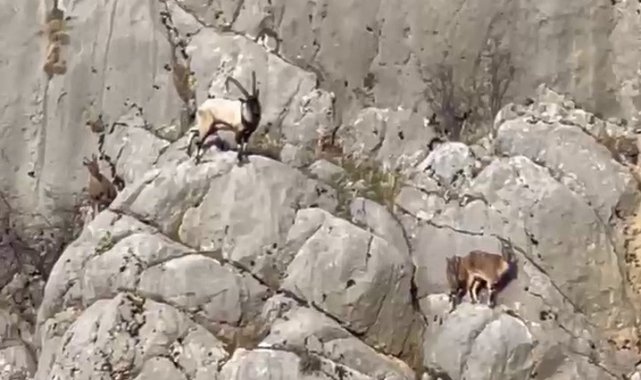 Adıyaman'ın Sincik ilçe girişinde yoldan geçen vatandaşlar Boğaz mevkiinde kayalıklarda dağ keçisi olduğunu fark etti. Vatandaşlar, kayalıklara tırmanan dağ keçilerini cep telefonlarıyla görüntüledi.