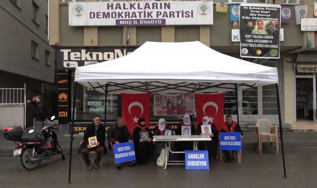 Dağa kaçırılan çocukları için HDP Muş İl Başkanlığı binası önünde oturma eylemi yapan anneler yağmurlu havaya rağmen ellerinde çocuklarının fotoğrafıyla bekleyişini sürdürdü.