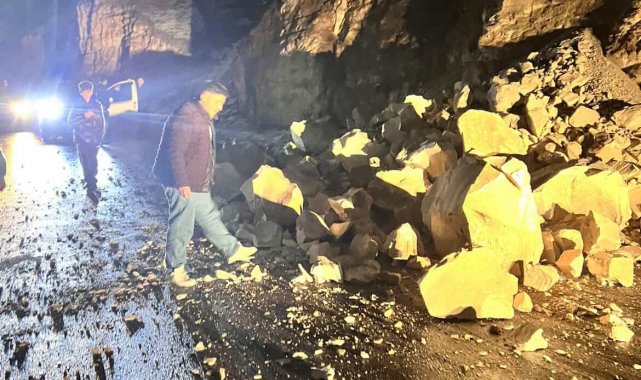 Dağdan kopan kayalar yolu trafiğe kapattı