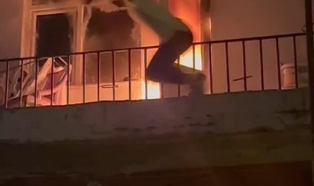 Kocaeli'nin İzmit ilçesinde 5 katlı binanın 1'inci katındaki daire alevlere teslim oldu. Yardım için daireye giren gencin balkondan atladığı anlar, anbean cep telefonu kamerasına yansıdı.