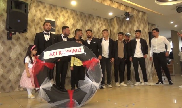 Sivas'ta bir düğünde damadın arkadaşları sıra dışı bir düğün hediyesi taktı. Tır şoförü olan damada lastik hediye eden arkadaşları, üzerine 'Acı kaybımız' yazdı.