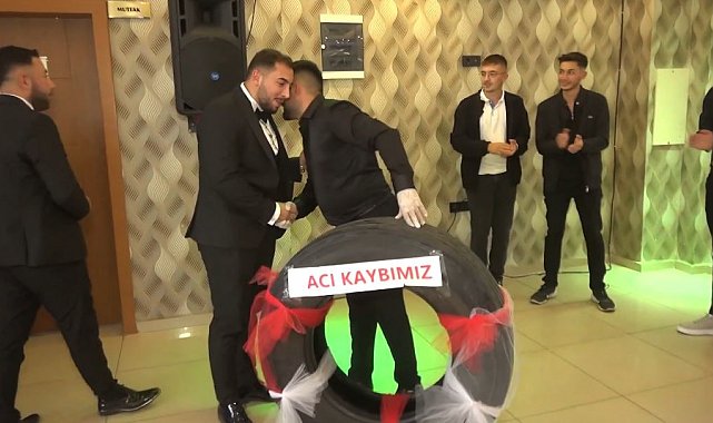 Sivas'ın Altınyayla ilçesinde yaşayan Burak Kaya, ilçede düzenlenen tören ile dünya evine girdi. Düğün merasiminde damadı yalnız bırakmayan arkadaşları tır şoförü olan damada sıra dışı bir hediye taktı. Takı merasiminin ardından satın aldıkları tır lastiğini düğün salonuna götüren damadın arkadaşları, üzerini süsleyerek 'Acı kaybımız' yazdı. Hediye tır lastiği ile fotoğraf çektiren damat ve arkadaşları, davetlilerden alkış topladı.