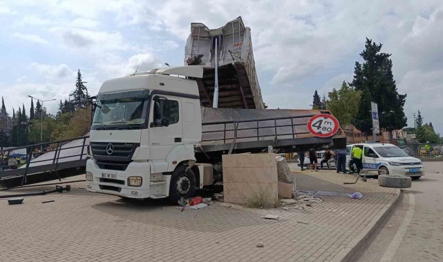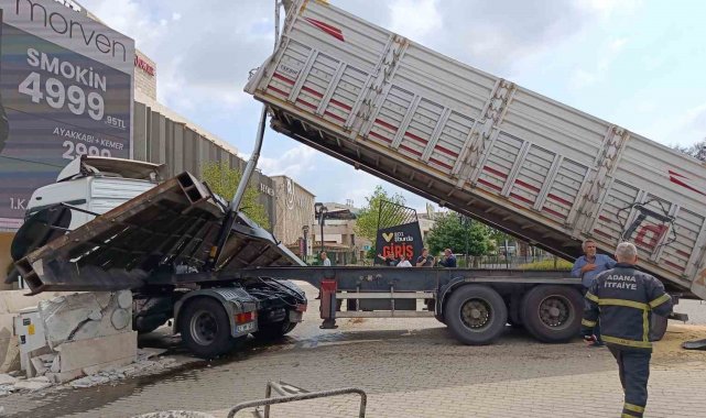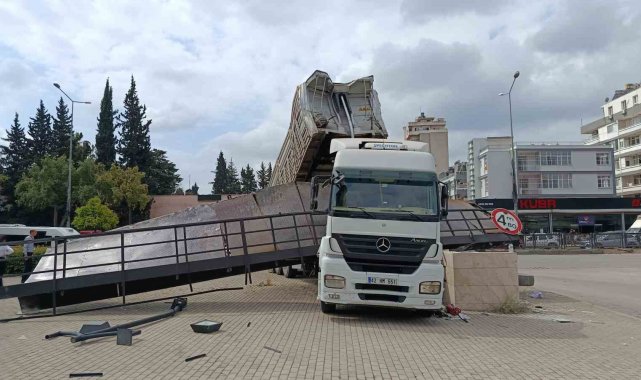 Adana'da damperi açılan tır üst geçide çarptı. Çarpmanın etkisiyle geçidin yarısı koparak tırın dorsesine sıkıştı, kazada kimse yaralanmadı. Tır sürücüsü ise, "Araçta uyarı olmadı, vurunca haberim oldu" dedi.