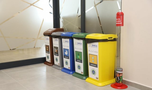 Darıca Belediyesi tarafından yeni hizmet binası ve ilçedeki diğer kamu kurumlarında "Sıfır Atık Projesi" kapsamında çöp kutuları kaldırılarak yerlerine geri dönüşüm üniteleri yerleştirildi.