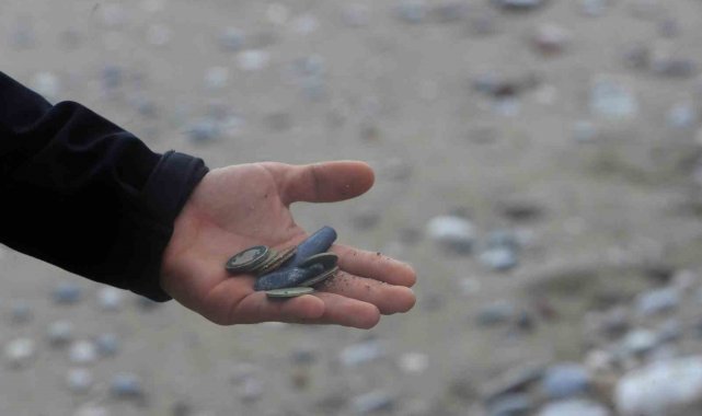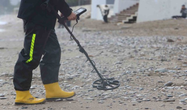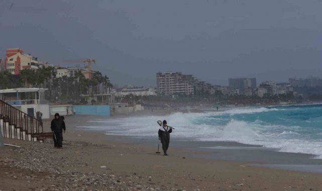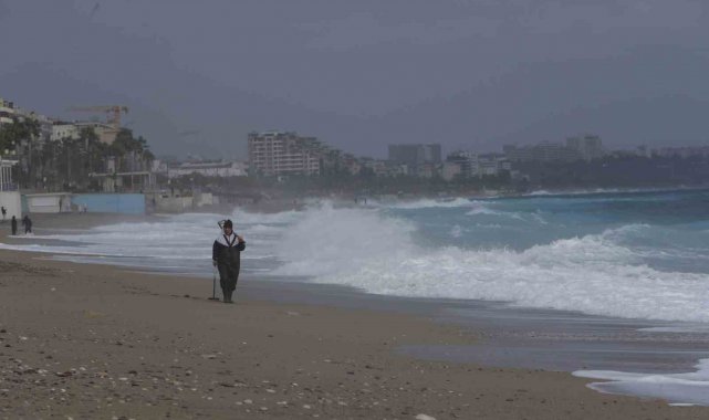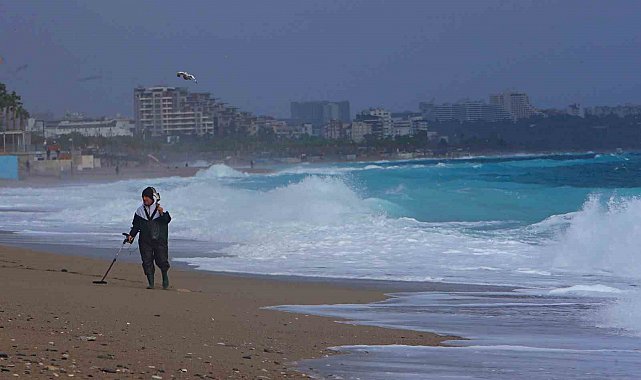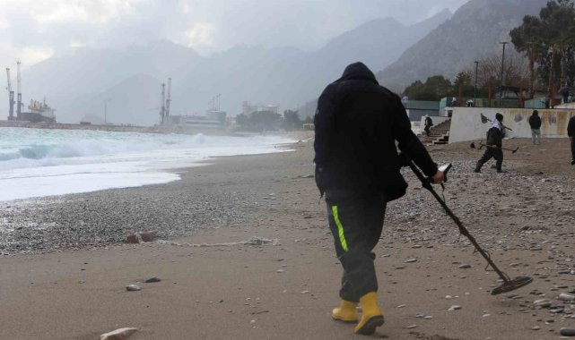 Antalya'da saatteki hızı 50 kilometreyi bulan rüzgar hayatı olumsuz etkilerken define avcıları sahile inerek değerli eşya ve madeni para aradı.