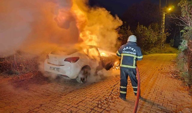 Hatay'da seyir halindeyken yanmaya başlayan otomobil kullanılmaz hale geldi.