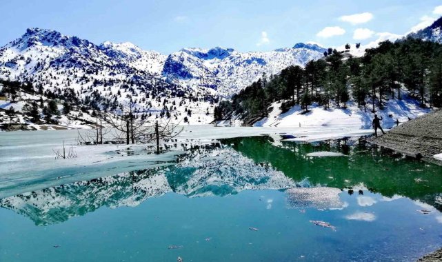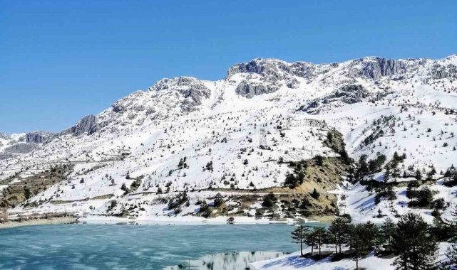 Göksun ilçesi Değirmendere Göleti'nin yüzeyi buzla kaplandı. Doğa tutkunları ise eşsiz manzaralarla karşılaştı.