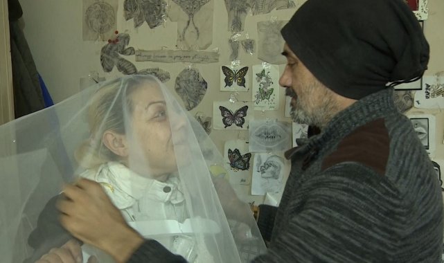 Dini nikahları olan resmi nikah için gün sayan Fatma ve Aslan çifti İhlas Medya ve TGRT Haber ekibinin kendilerine getirdiği gelinliği görünce gözyaşlarına boğuldu.