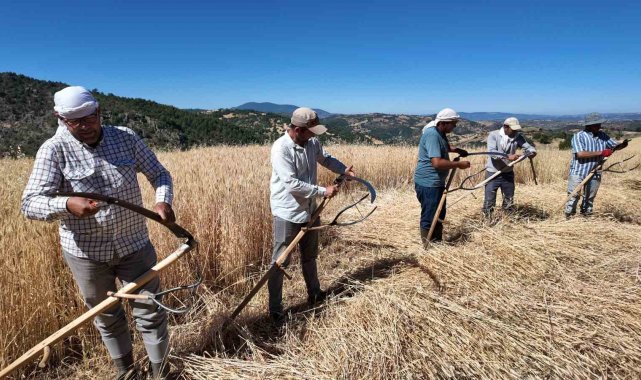 Manisa'nın Demirci ilçesinde kırsal mahallelerde buğday, arpa ve çavdar üreten çiftçiler hasatlarını imece usulü ile el birliği içerisinde gerçekleştiriyor.