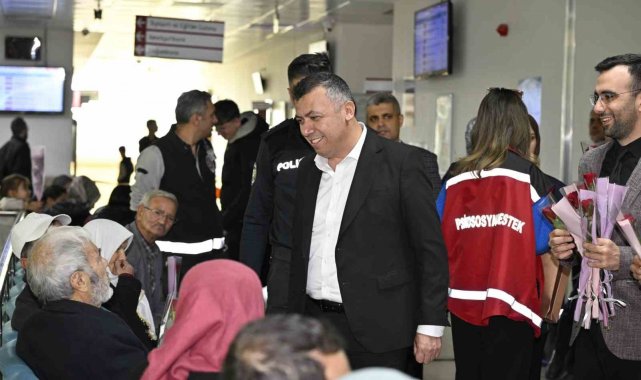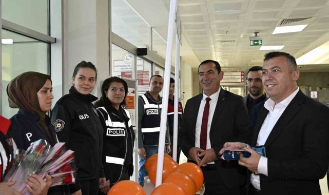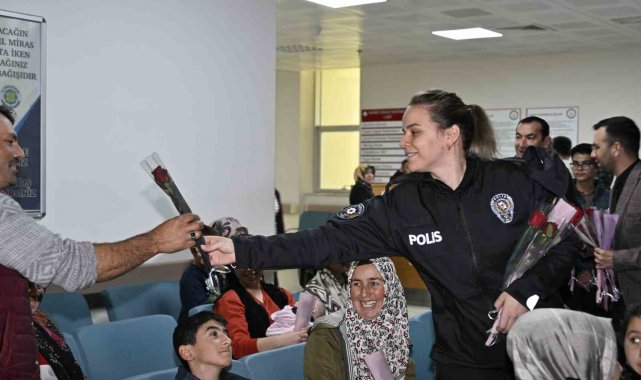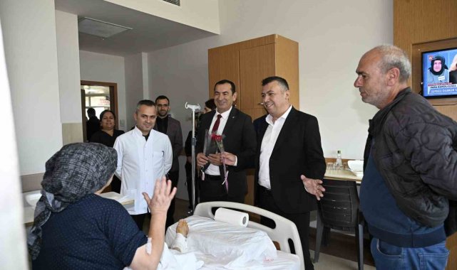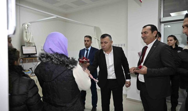 Kaymakam Fatih Bayram ve Belediye Başkan Yardımcısı İsmail Hakkı Gül de hastanede tedavi gören kadın hastaları ziyaret ederken çiçek takdim etti.