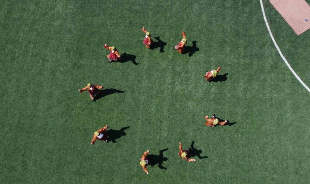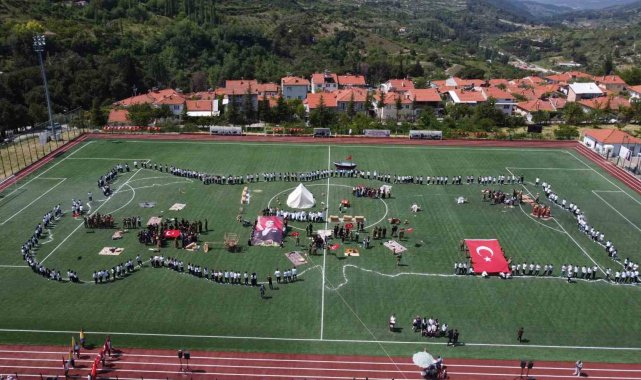 Manisa'nın Demirci ilçesinde 19 Mayıs Atatürk'ü Anma, Gençlik ve Spor Bayramı törenlerinde gençlerin bedenleri ile sahaya çizdikleri dev Türkiye haritasında temsili Kurtuluş savaşı canlandırılması büyük beğeni aldı.