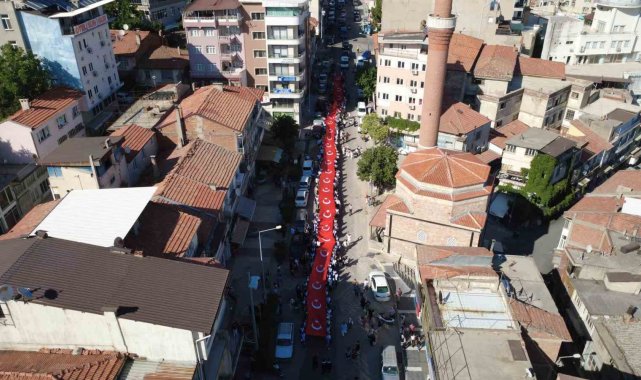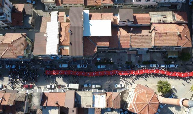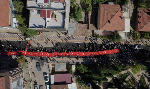 Öğrenciler yürüyüşte yaklaşık 200 metre uzunluğunda dev Türk bayrağı açtı.