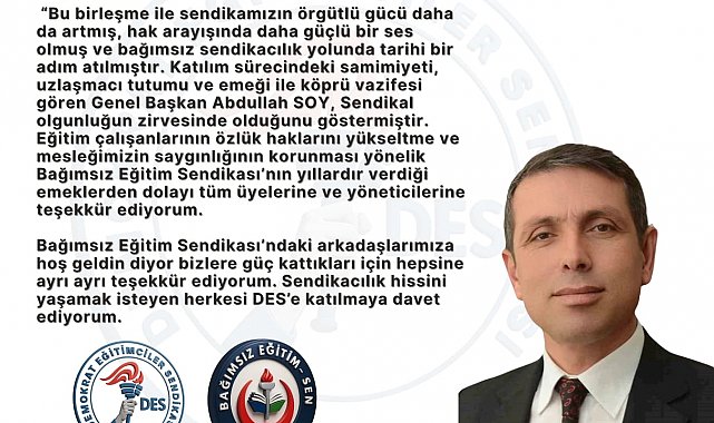 Bağımsız Eğitim-Sen Genel Başkanı Abdullah Soy, "Eğitim sendikaları içinde bağımsızlığı ve ilkeli duruşuyla tanınırlığı olan Demokrat Eğitimciler Sendikası'na katılarak güç birliği sağlamayı amaçlamaktayız. Bağımsız Eğitim Sendikası olarak, eğitim çalışanlarının özlük hakları ve demokratik talepleri için yıllardır verdiğimiz mücadeleyi bundan sonra DES çatısı altında devam ettireceğiz. Demokrat Eğitimciler Sendikası'nda mücadele eden arkadaşlarımızla güzel işler çıkartacağımıza inancım tamdır. Bu birlikteliğin mimarı olan DES Genel başkanı İshak Çelebi'ye teşekkür ederek diğer sendikaları da DES çatısı altında toplanmaya davet ediyorum" dedi.