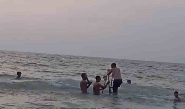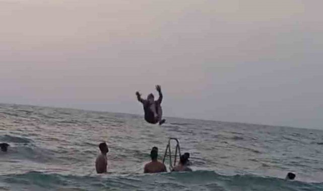 Arsuz ilçesi Karaağaç sahilinde serinlemek için denize gelen bir grup vatandaş, yanlarında merdiven de getirdi. Denizin ortasına merdiven kuran ve üzerine çıkarak atlayan gençler kameralara yansıdı. Gençlerin neşeli halleri renkli görüntüler oluşturdu.