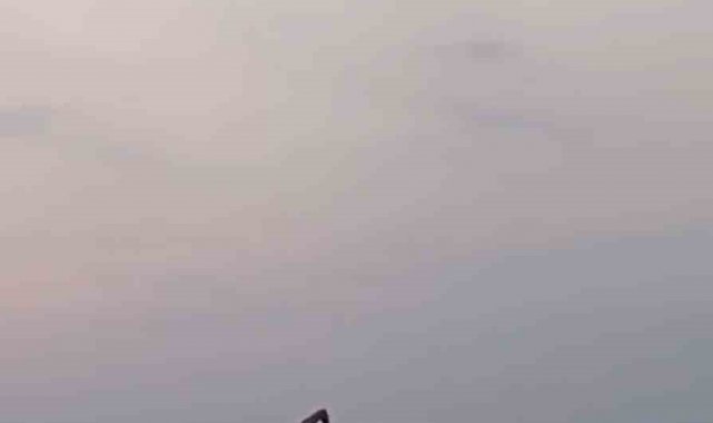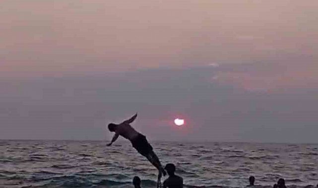 Hatay'da bir grup genç, denizde suyun içine kurdukları merdivenin üzerinden atlayarak doyasıya eğlendi.