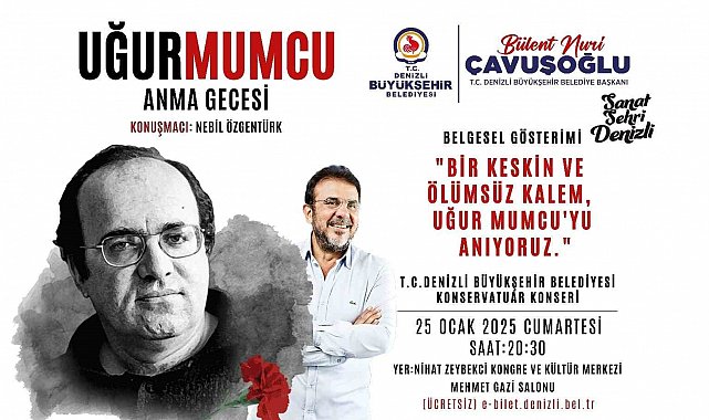 Program, Gazeteci-yönetmen Nebil Özgentürk'ün sunumuyla Uğur Mumcu'nun yaşamını ve fikirlerini ele alan "Bir keskin ve ölümsüz kalem, Uğur Mumcu'yu anıyoruz" başlıklı belgesel gösterimiyle başlayacak. Özgentürk'ün Uğur Mumcu'nun düşünce dünyasına ışık tutacağı özel konuşmasıyla devam edecek etkinlik, Denizli Büyükşehir Belediyesi Konservatuvarı tarafından hazırlanmış özel bir konserle taçlanacak. 25 Ocak Cumartesi günü saat 20.30'da Nihat Zeybekci Kongre ve Kültür Merkezi Mehmet Gazi Salonunda ücretsiz gerçekleştirecek etkinlikle ilgili rezervasyon Denizli Büyükşehir Belediyesi'nin internet adresinden yapılabilecek.