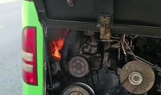 Halk otobüsünün motor kısmından yükselen dumanları gören vatandaşlar, şoförü uyardı. Yolcuları tahliye eden sürücü, dumanların kapladığı aracı geri geriye kullanarak, güvenli bir yere çekti.