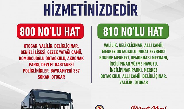 800 ve 810 No'lu Transit Hat, şehir içi ulaşımda ana arterleri kullanarak, yoğun bölgelerde yolculuk süresini en aza indirmeyi hedefliyor. 800 numaralı otobüsün güzergahı; Otogar- Valilik- Delikliçınar- Denizli Lisesi- Gezek Yatağı Camii- Kömürcüoğlu Ortaokulu- Akkonak Parkı- Devlet Hastanesi Poliklinikler- Bayramyeri 357. Sokak- Otogar güzergahında hizmet verecek. 810 No'lu Transit Hat ise, Valilik-Delikliçınar- Allı Camii- Merkez Ortaokulu- Nihat Zeybekci Kongre Merkezi- Demokrasi Meydanı- İncilipınar Yüzme Havuzu- İncilipınar Parkı- Merkez Ortaokulu- Allı Camii-Delikliçınar-Valilik ve Otogar güzergahlarında çalışacak. Yeni hatlarla ilgili detaylı bilgiye Denizli Büyükşehir Belediyesi Ulaşım A.Ş.'nin resmi web sitesi ve Denizli Büyükşehir Belediyesi Ulaşım Portalı üzerinden ulaşabilir.