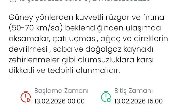 Meteoroloji Genel Müdürlüğü tarafından Denizli için kuvvetli rüzgar ve fırtına uyarısı yapıldı. Yapılan değerlendirmelere göre, 13 Şubat 2026 Cuma günü saat 00.00'dan itibaren güney yönlerden 50-70 kilometre/saat hızında kuvvetli rüzgar ve kısa süreli fırtına bekleniyor. Uyarının aynı gün saat 15.00'e kadar geçerli olacağı bildirildi. Yetkililer, kuvvetli rüzgar nedeniyle ulaşımda aksamalar, çatı uçması, ağaç ve direklerin devrilmesi ile soba ve doğalgaz kaynaklı zehirlenmeler gibi olumsuzluklara karşı vatandaşların dikkatli ve tedbirli olmaları gerektiğini kaydetti.