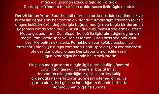 Denizli İdman Yurdu Spor Kulübü As Başkanı Aykut Akçagül tarafından yapılan açıklamada; "10 Mart 2025 tarihinde Saraçoğlu Stadyumunda Pamukkale Spor ve Denizli İdman Yurdu U17 maçında yaşanan üzücü olayla ilgili olarak Denizlispor yönetim kurulunun açıklamasını üzüntüyle okuduk. Denizli İdman Yurdu Spor Kulübü olarak sporda dostluk centilmenlik ve kardeşlik değerlerini her zaman ön planda tutmaktayız. Yaşanan talihsiz olayın Kulübümüzün değerleri ile uyuşmadığını ve böyle bir durumun yaşanmış olmasından büyük üzüntü duyduğumuzu ifade etmek isteriz. Maçta yaşananların, Denizlispor Kulübü ile ilgisi olmadığını, oynanan maçın Pamukkale Spor ve Denizli idman Yurdu arasında olduğunu özellikle belirtmek isteriz. Pamukkale Spor Kulübü Başkanı ve antrenörü olan kişinin aynı zamanda Denizlispor Altyapı Koordinatörü olmasından dolayı olayın Denizlispor'a mal edilmesinin uygun olmadığını önemle belirtmek isteriz. Maç sonunda yaşanan olayla ilgili olarak kulüp yönetimi tarafından gerekli incelemeler başlatılmıştır. Her zaman dile getirdiğimiz gibi, iki kardeş kulüp arasındaki ilişkilerin zarar görmesini istemediğimizi ve sporun birleştirici gücüne inandığımızı önemle belirtiriz" ifadeleri kullanıldı.