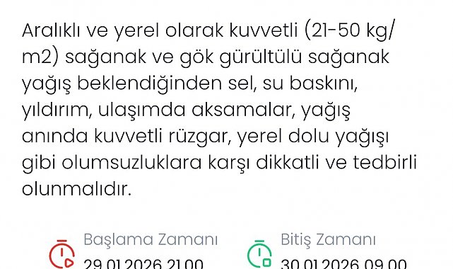 Meteoroloji Genel Müdürlüğü, Denizli için kuvvetli sağanak ve gök gürültülü sağanak yağış uyarısında bulundu. Yapılan açıklamaya göre, 29 Ocak 2026 Perşembe günü saat 21.00'den 30 Ocak 2026 Cuma günü saat 09.00'a kadar, Denizli genelinde aralıklı ve yerel olarak kuvvetli (metrekareye 21-50 kilogram) sağanak ve gök gürültülü sağanak yağış bekleniyor. Meteoroloji, beklenen kuvvetli yağışlarla birlikte sel ve su baskını, yıldırım, ulaşımda aksamalar, yağış anında kuvvetli rüzgar ve yerel dolu yağışı gibi olumsuzluklara karşı vatandaşların dikkatli ve tedbirli olmaları gerektiğini bildirdi. Ayrıca yaşanabilecek olumsuzluklara karşı gerekli önlemlerin alınması konusunda uyarıda bulundu.
