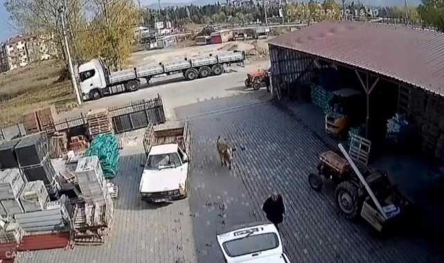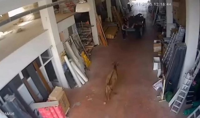 O anlar ise iş yerinin güvenlik kameralarına yansıdı. Görüntülerde, depoya giren ineğin yürüyen bir vatandaşa çarparak düşürdüğü görülüyor. Daha sonra üzerlerine koşan inekten çalışanlar son anda kurtuluyor. İnek daha sonra kendisini uzaklaştırmaya çalışan vatandaşın arkasından koşmaya başlıyor.