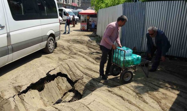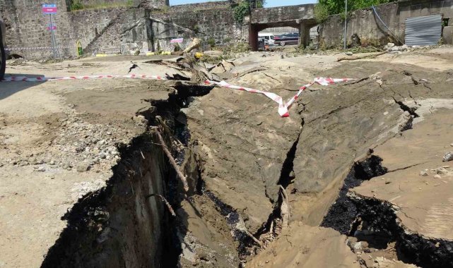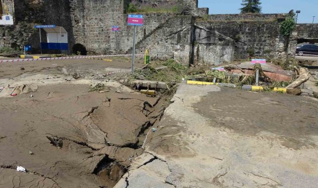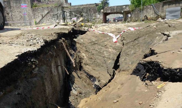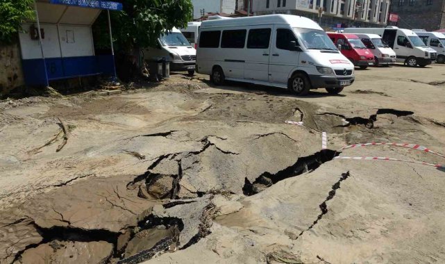 Trabzon'un Ortahisar ilçesinde dün etkili şiddetli yağışlar sonrasında yaşanan selde Pazarkapı mahallesinde minibüs duraklarının bulunduğu alandaki beton zeminde oluşan görüntü depremi aratmadı.