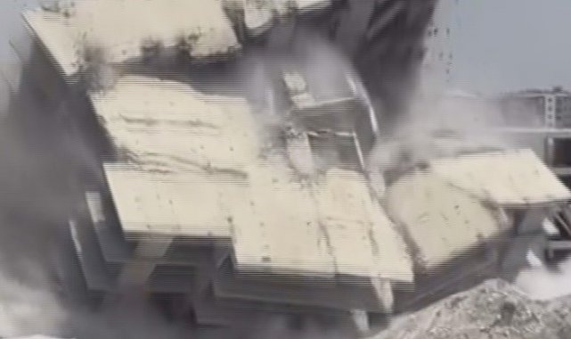 Kahramanmaraş merkezli depremlerde ağır hasar alan Hatay'da mahkeme süreci sona eren binaların yıkım ve enkaz kaldırma çalışmaları aralıksız sürüyor. Antakya ilçesi Saraycık Mahallesi'nde bulunan 12 katlı bina, iş makinesinin darbeleriyle kontrollü olarak yıkıldı. 12 katlı binanın yıkımı esnasında herhangi bir olumsuzluk yaşanmadı. Binanın yıkımı cep telefonu kamerasıyla kaydedildi.