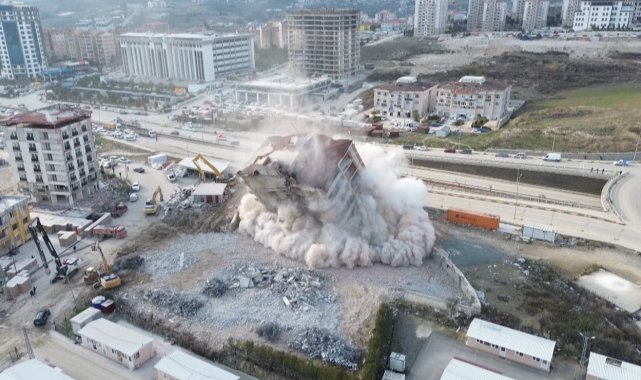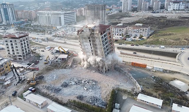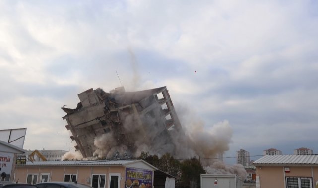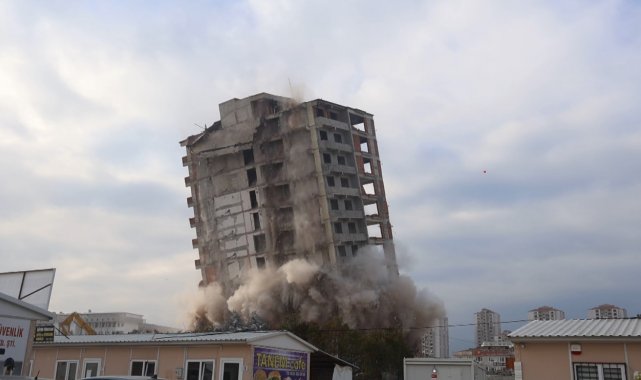 Hatay'ın Antakya ilçesinde 14 katlı binanın iş makinesiyle halatla çekilerek yıkımı vatandaşlara deprem etkisi yaşattı. Kontrollü olarak yıkılan binanın yerle bir olduğu anlar havadan görüntülendi.