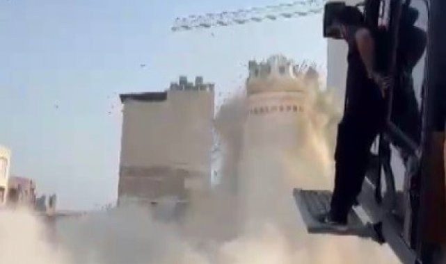 Depremde ağır hasar alan minarenin yerle bir olduğu anlar kameraya yansıdı