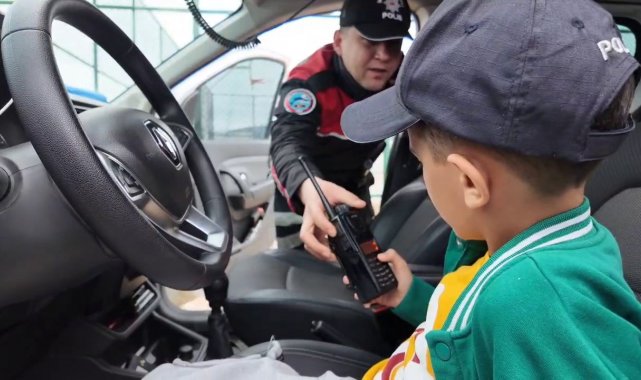 Polis ekipleri, polisleri çok seven Çınar Efe Toker'i polis aracına bindirerek telsizden anons çektirip, kask taktı.