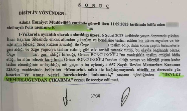 Adana'da depremde yıkılan binanın enkazından çıkan altınları, hayatını kaybedenlerin yakınlarına teslim ettikten sonra, "Savcılık geri istiyor, bütün altınlar toplandıktan sonra yeniden teslim edeceğiz" diyerek zimmetine geçirdiği tespit edilen polis memuru hakkında 2 kez 'devlet memurluğundan çıkartma' cezası verildi. Soruşturması devam eden eski polisin, önümüzdeki günlerde ağır ceza mahkemesinde yargılanacağı öğrenildi.