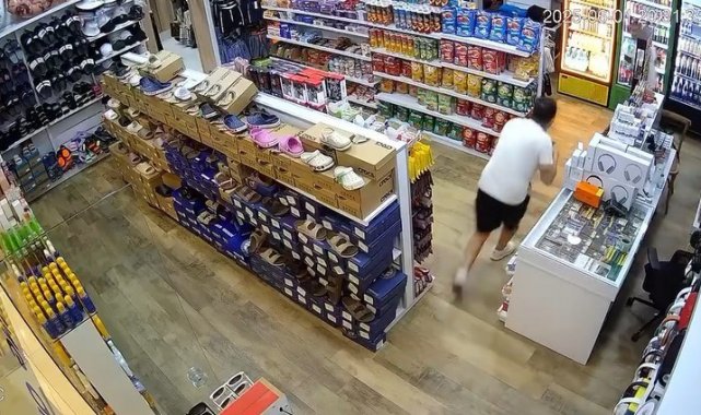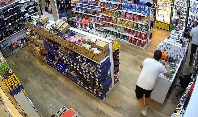 Antalya'nın Alanya ilçesinde dün akşam saatlerinde meydana gelen 4 büyüklüğünde depreme markette yakalanan bir kişinin elindeki çay bardağı ile kaçtığı anlar kameralara yansıdı.