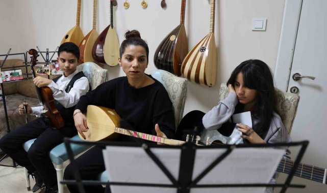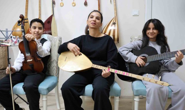 Depremden sonra müziğe sarılan anne çocuklarıyla üç enstrüman çalıyor